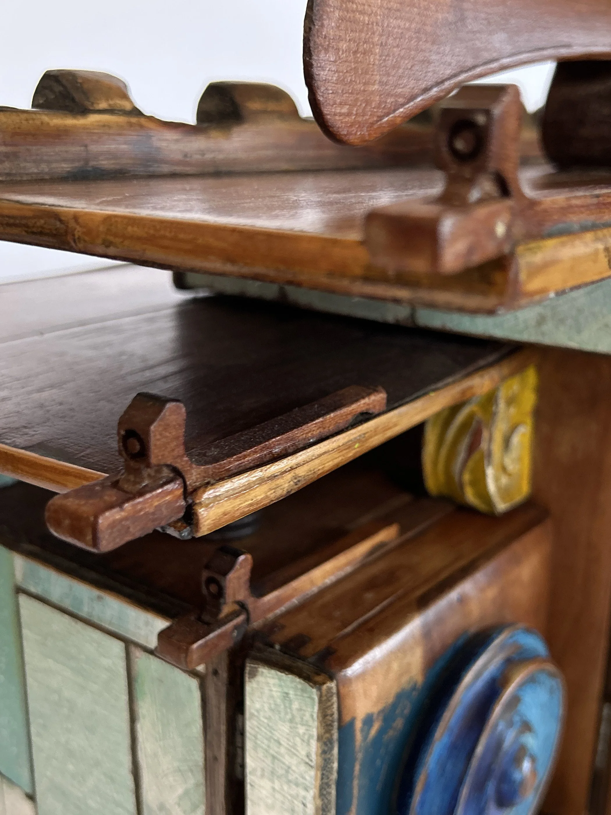 Imperial intends to feel like a luxurious livable space, Frank Llloyd Wright style. The Imperial Hotel in Tokyo has always left an impression on me, and this piece melds many memories of my personal encounters with his many structures. An eclectic mix of antique scraps and authentic junk come together in a semi-refined manner. As if Robinson Crusoe had access to some floor plans and made the best of it. Made from eco-friendly, up-cycled materials, Imperial is a hand-crafted, one-of-a-kind wooden sculpture, showcasing sustainable art in in this homage to FFLW, the great master. The architectural design of the project includes cubby compartments to stash stuff, say, colognes and pocket squares.